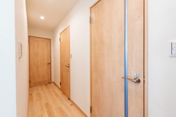 部屋をつなぐ廊下は、木の扉と白壁で優しい印象になっています。