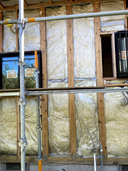 今回、内壁は残す部分があるので、外から断熱材を入れていきました。