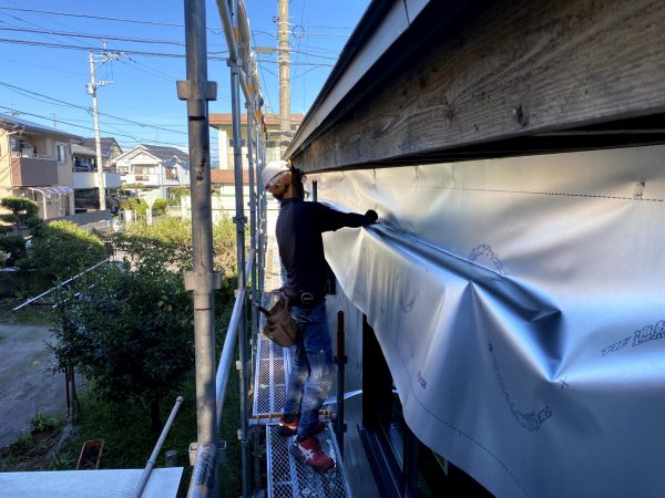 次に新しい透湿シートを張っていきます。今回は遮熱タイプの透湿シートを使います。
