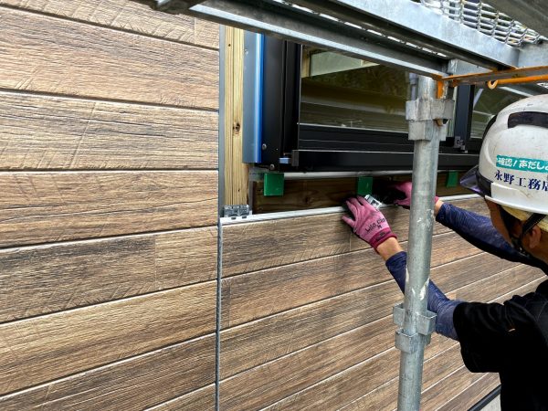 サイディングは、下の方から金物に引っ掛けるようにして、重ねて張っていきます。