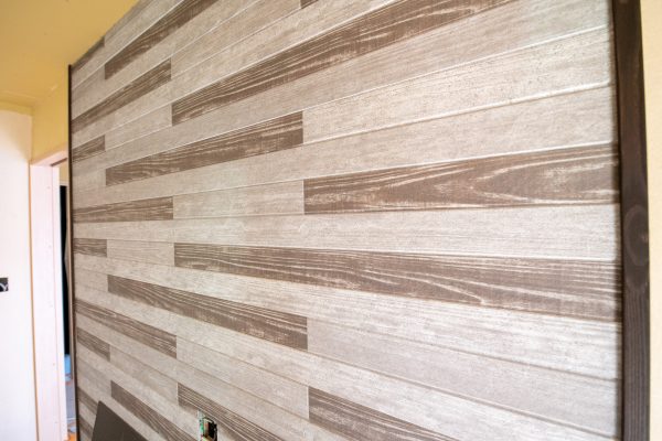 アクセントボードの施工中です。今回は、通常は外壁に使用するサイディングを