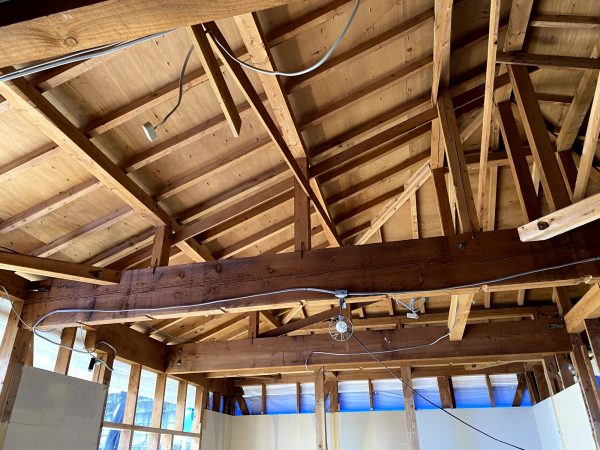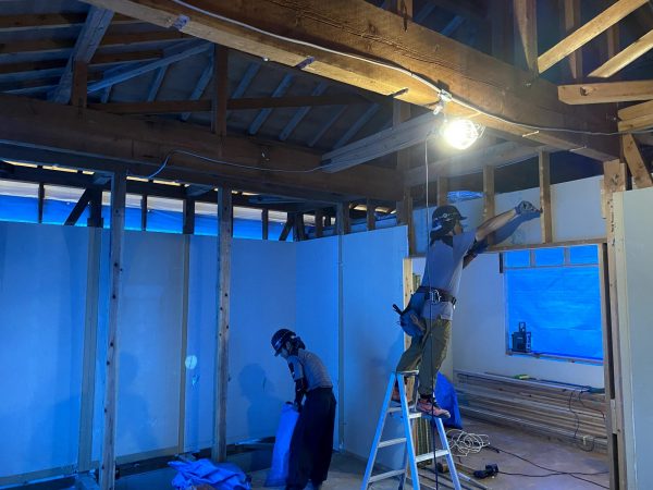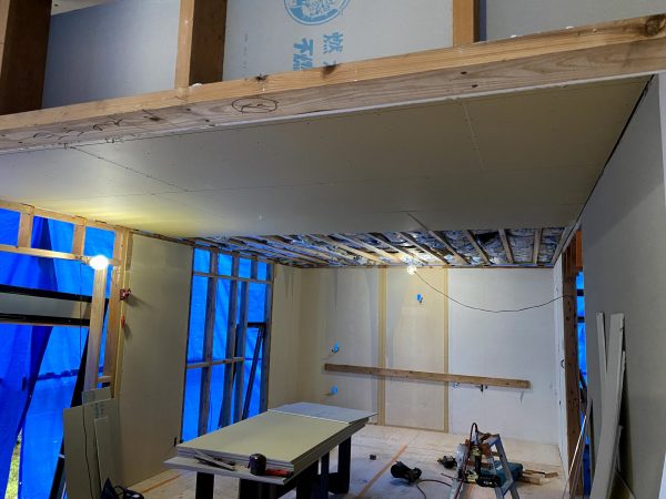 次に、木材で下地を組んだ天井に石膏ボードを張っていきます。