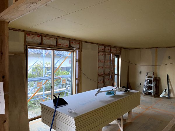次に、サッシ・窓枠を取り付けたら、残りの壁の部分に石膏ボードを張っていきます。